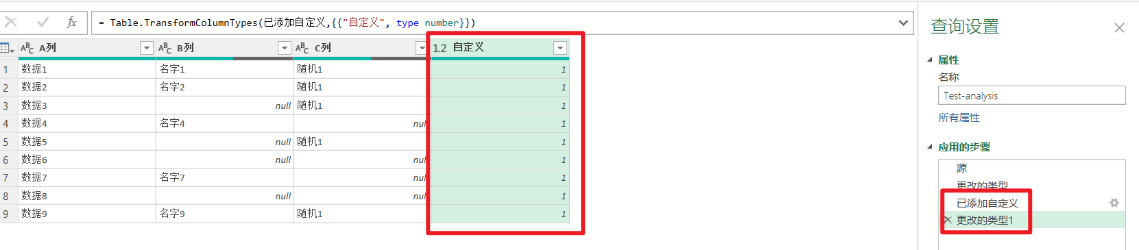主查询 (2) → 重命名为"分析_A" → 删除B、C、D列