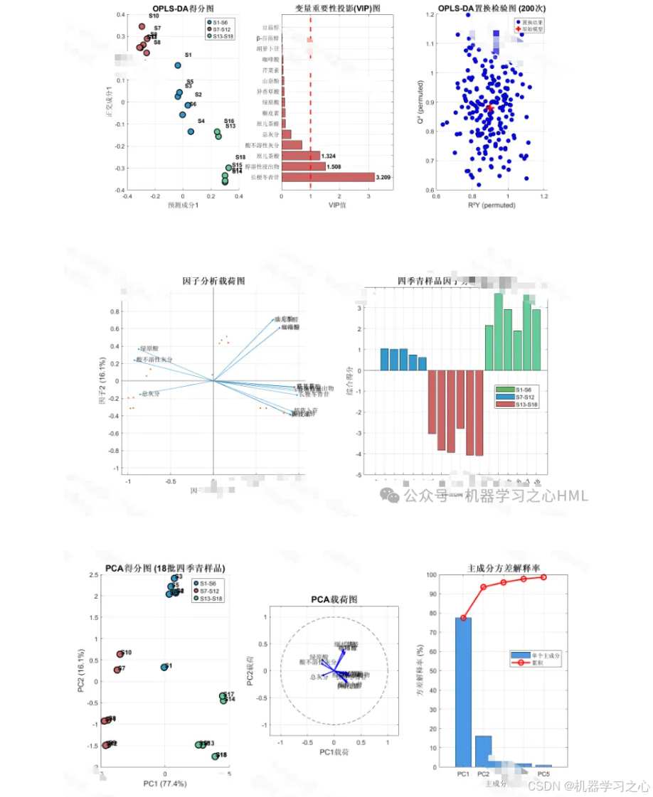 - 输出: 得分图(观察样本分布)、载荷图(观察指标贡献)。