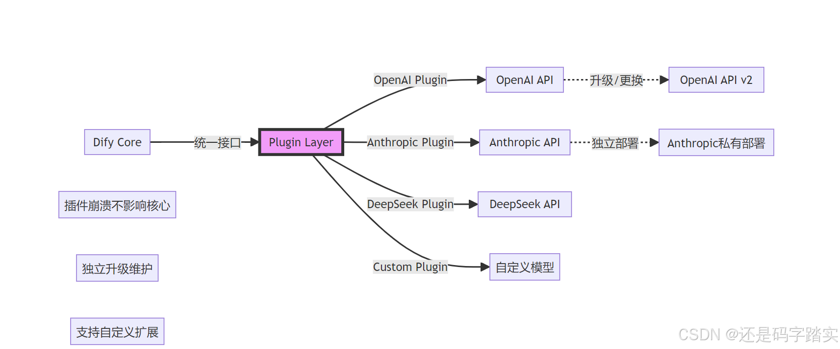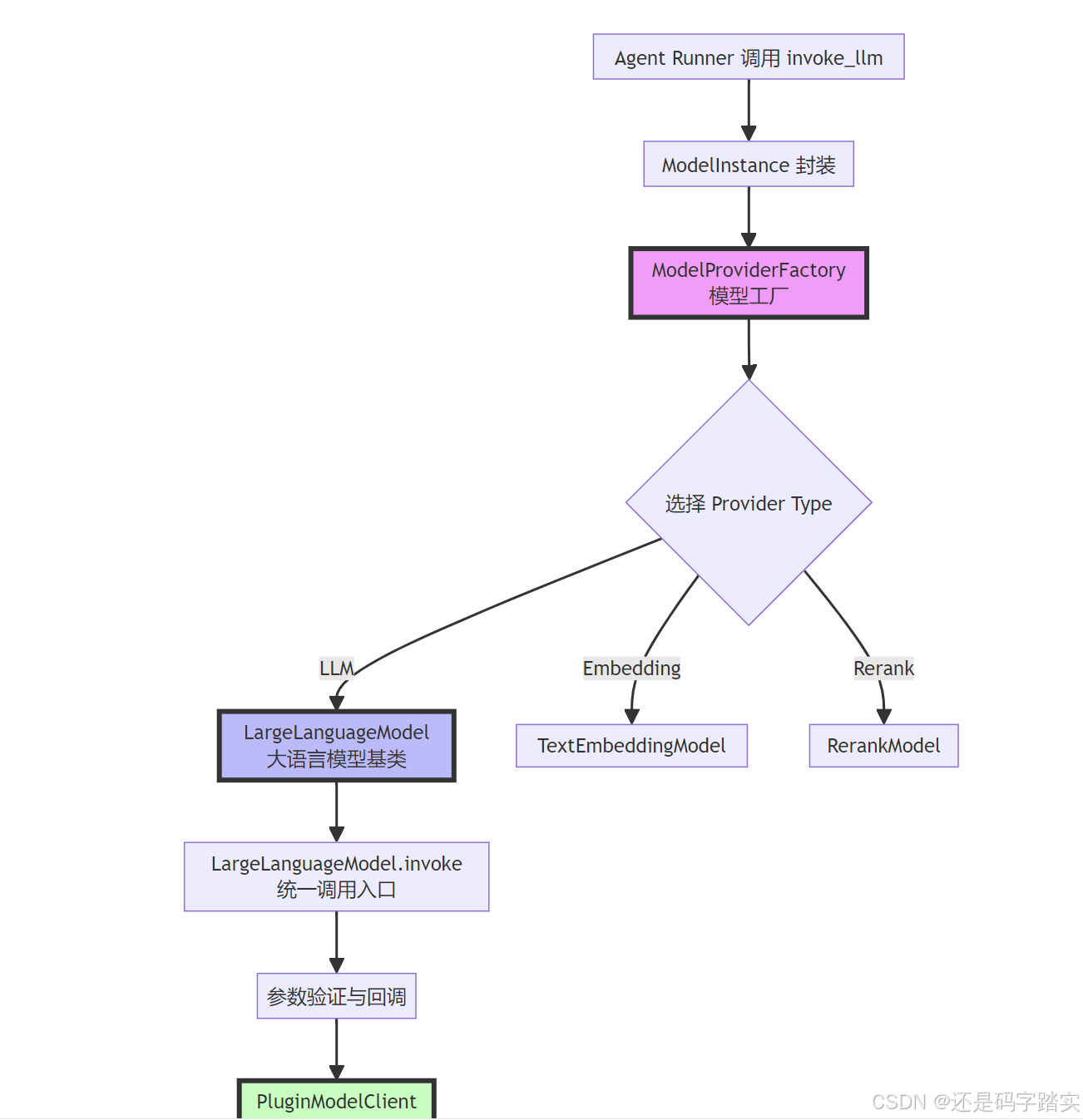 LargeLanguageModel.invoke()作为所有模型的调用入口,接收标准化的PromptMessage和PromptMessageTool。 - 插件化提供商 :通过
