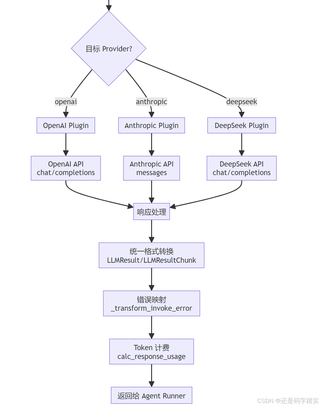 ModelProviderFactory.get_model_type_instance()动态加载不同模型(OpenAI/Anthropic/DeepSeek),每个 Provider 实现相同的invoke接口但封装各自的 API 调用逻辑。 - 错误映射机制 :使用