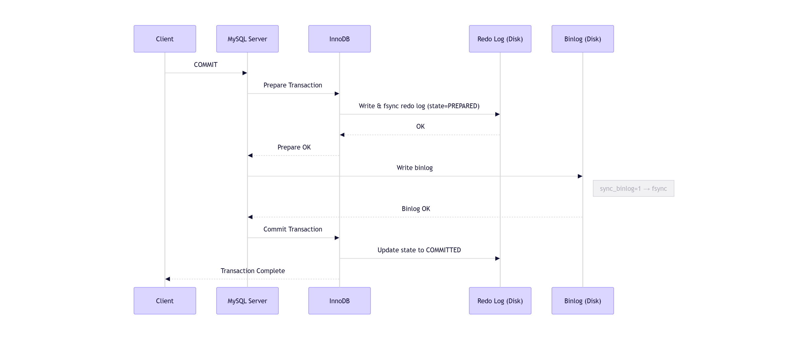 | 3 | InnoDB → Redo Log (Disk) | Write & fsync redo log (state=PREPARED) | InnoDB 将事务的 redo log 写入日志文件,并调用 fsync() 强制刷盘,事务状态标记为 PREPARED。这是崩溃恢复的关键依据。 |