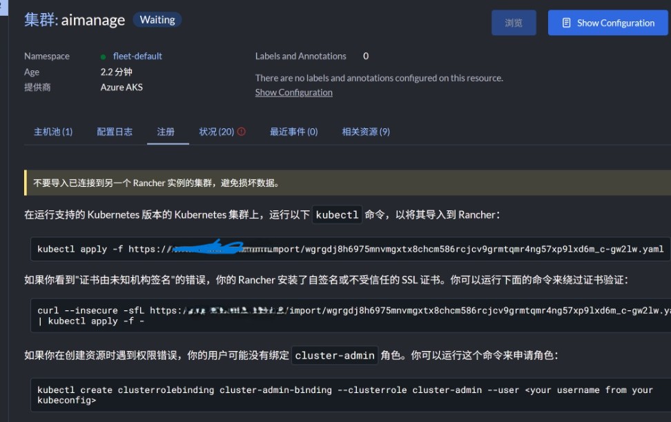 - 按照 Rancher 提示,复制第二行命令用 kubectl 执行。如果未放通 Rancher 的 443 入站,会报错。
