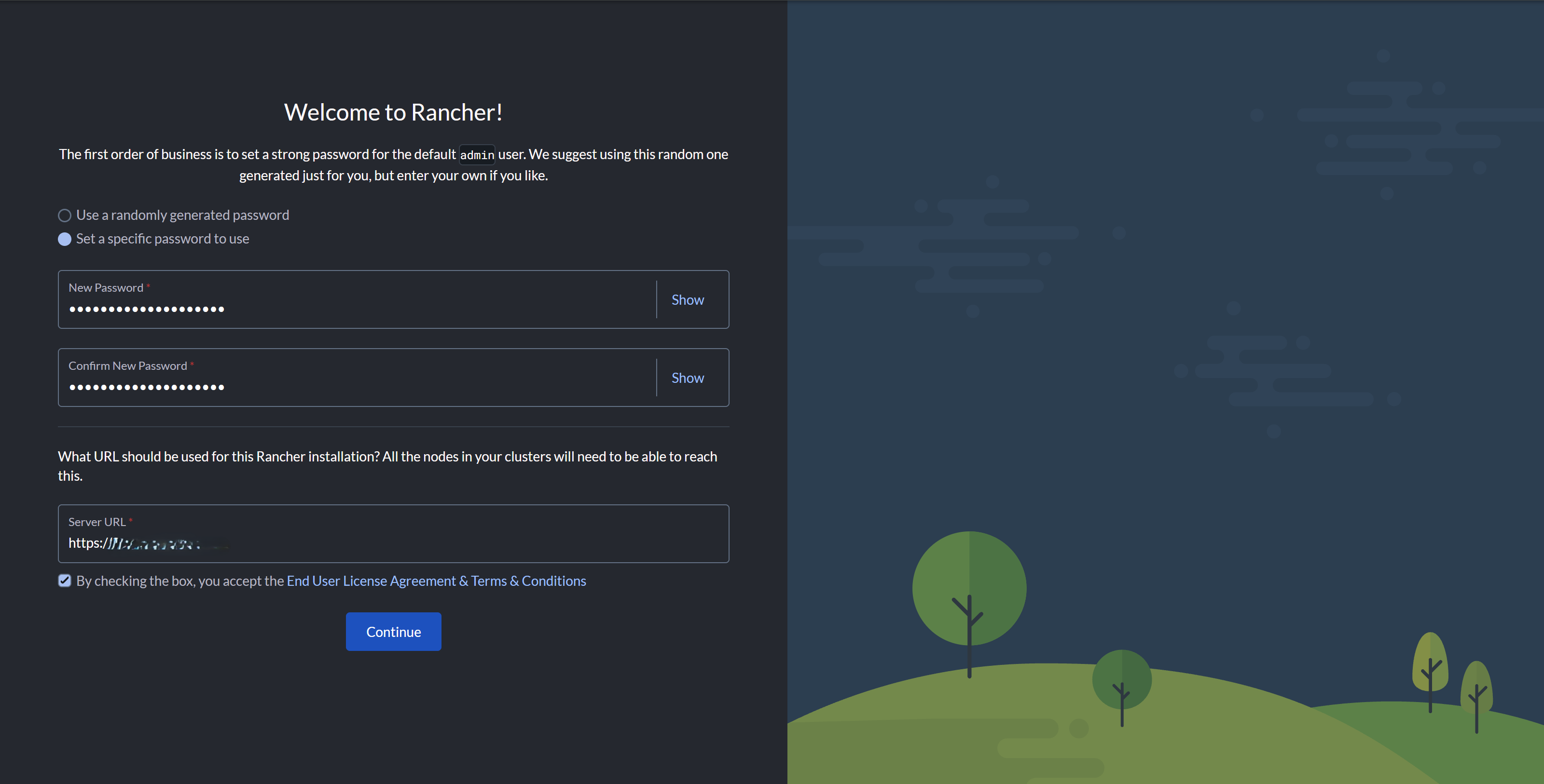 https://<主机名或IP>,根据界面提示完成 Rancher 初始化设置。