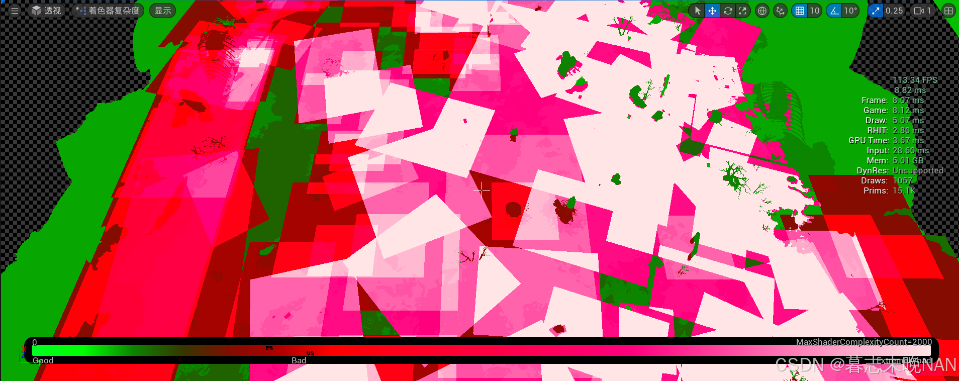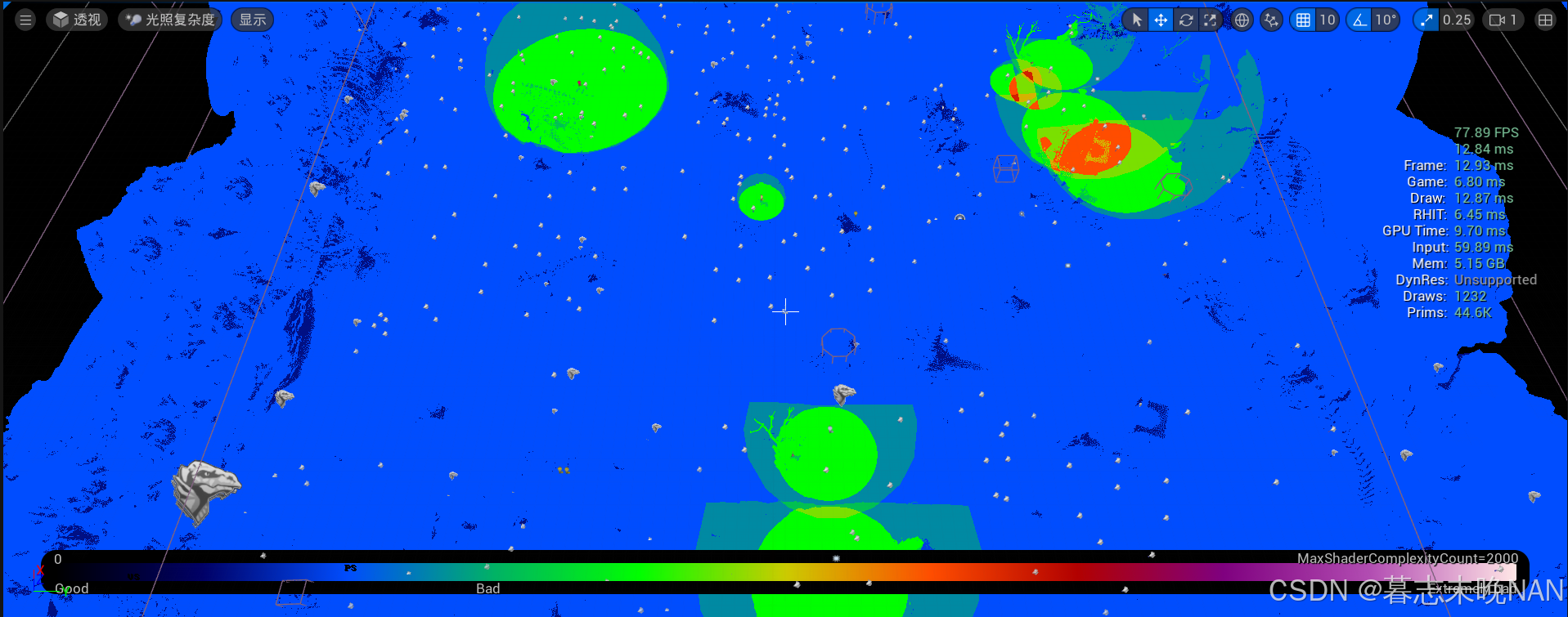 还有着色器复杂度的渲染显示,可以查看哪里过渡绘制,颜色越白,性能越差