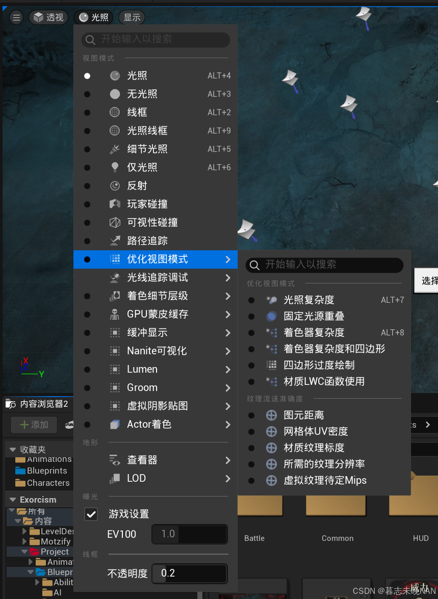 对于光照,我们可以选择关卡界面光照下面的优化视图模式,选择光照复杂度,根据界面查看哪里光照消耗过大。