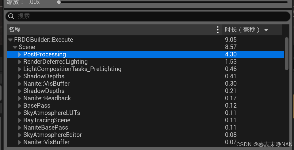 我这里可以看到后处理渲染时长占了一半,可以后续接着查看,按需查找对应消耗大的调用。