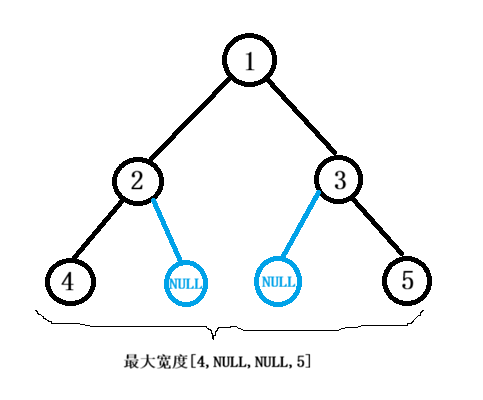 如果只统计每层非空节点的数量,各层数量分别是 1、2、2,最大值是 2;但题目要求的 "宽度"需要把中间的空节点都算上,第 3 层的宽度是 4(4 和 5 之间有 2 个空节点,加上自身共 4 个位置),这才是最终答案。