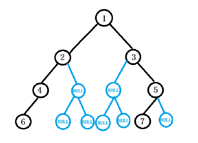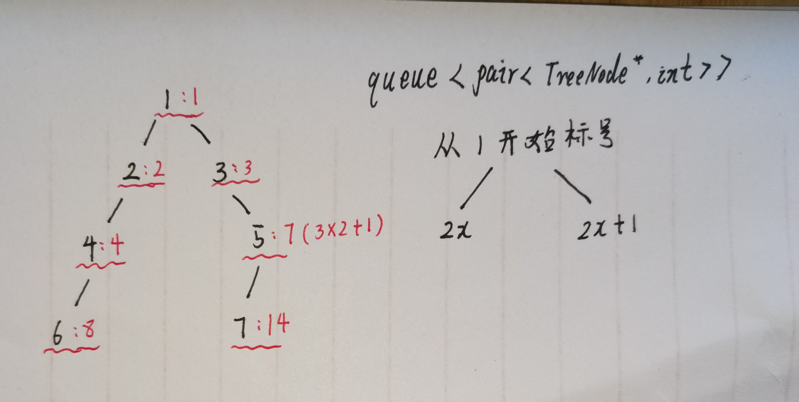 pair<节点指针, 节点编号>的键值对,将节点和其唯一编号绑定; - 按层遍历二叉树,每一层节点入队时,自动继承父节点的编号规则生成子节点编号,绑定关系如下图: