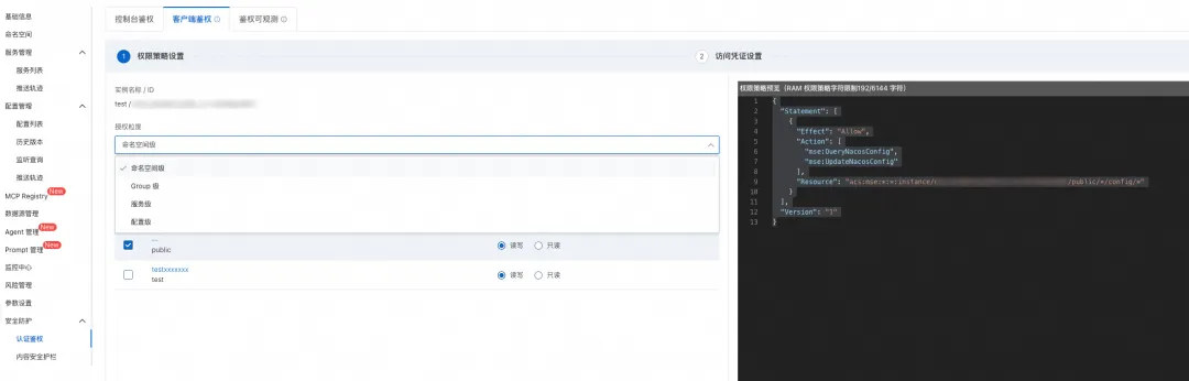 策略生成与配置: 在 Nacos 控制台"认证鉴权"模版中生成权限策略,并在 RAM 控制台授予指定的子账号。