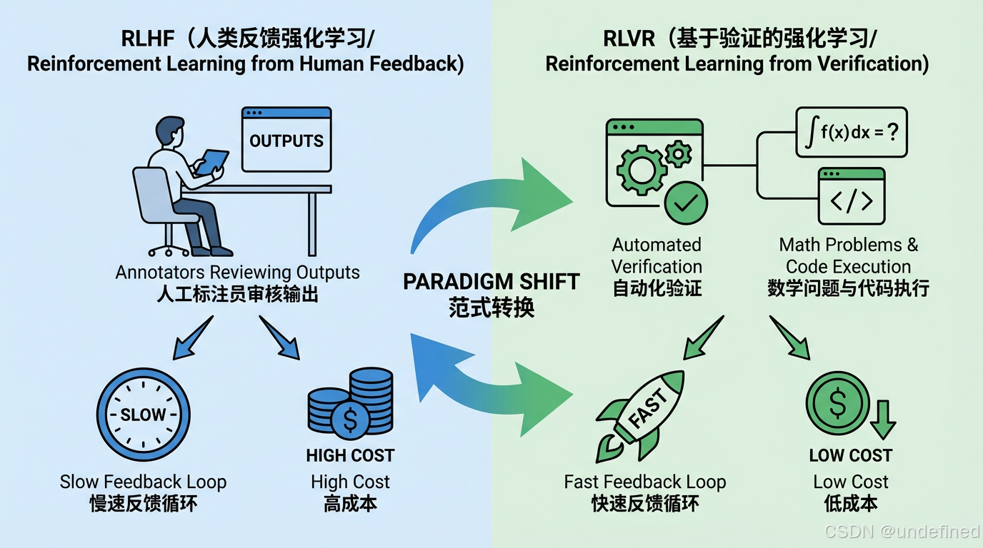 打个比方:RLHF像请老师批改作文,标准不一;RLVR像做数学卷子,对就是对、错就是错。