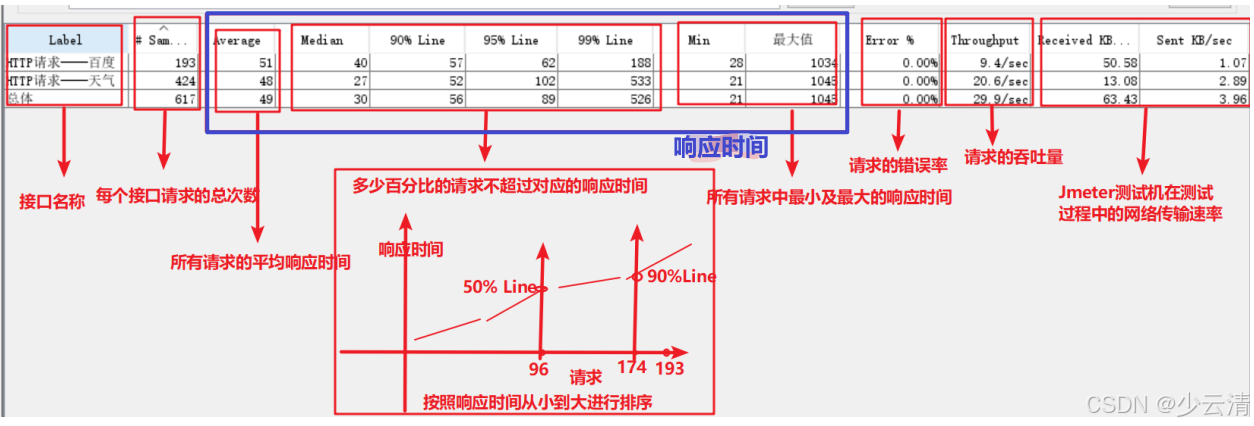 6. 95%百分比:95% <= 时间;代表95%的请求,发送的响应时间 (单位:毫秒)