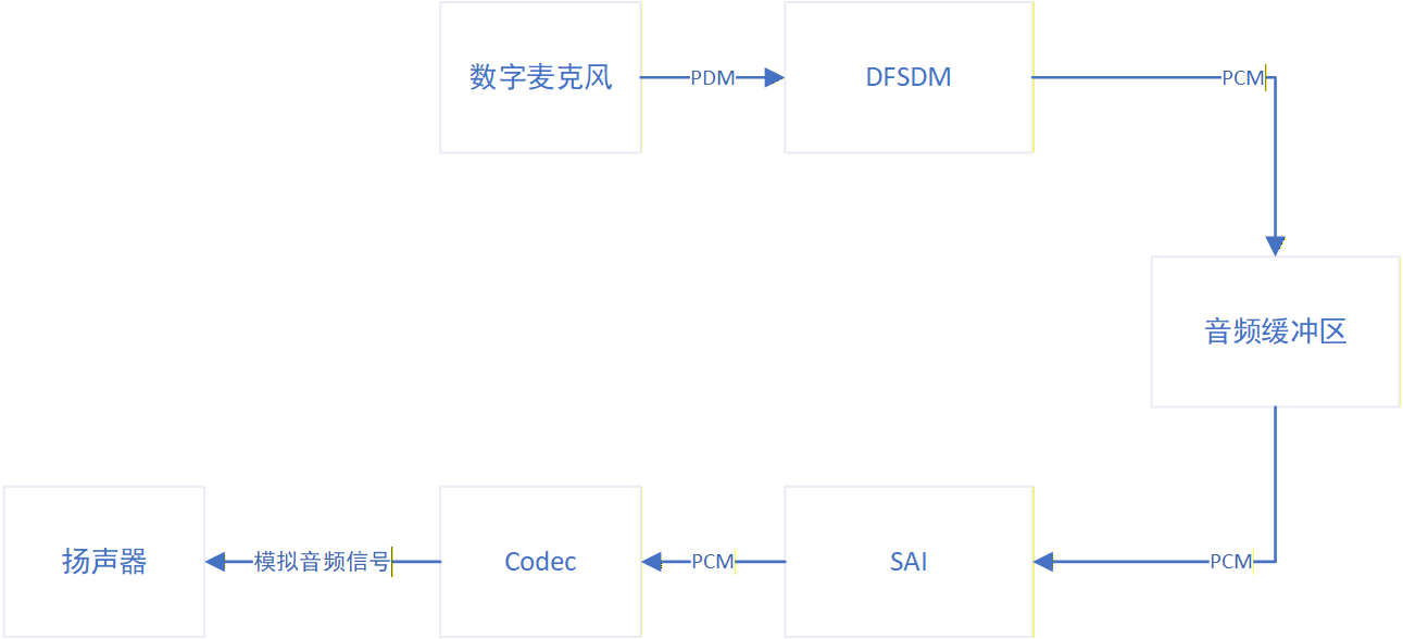 在录音流程中,数字麦克风采集到的 PDM 数据 送入 DFSDM 模块,由 DFSDM 转换为 PCM 数据流。应用层通过 DMA + 回调函数 的方式,将转换后的 PCM 数据拷贝到用户指定的录音缓冲区,从而完成音频录制。