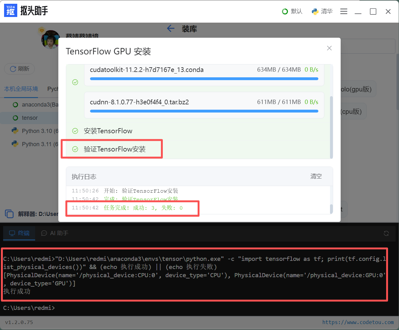 工具会自动:检测系统环境,Python版本、选择兼容的TensorFlow版本、安装所有必要依赖、配置CUDA/cuDNN(如需要)、验证安装完整性和正确性。