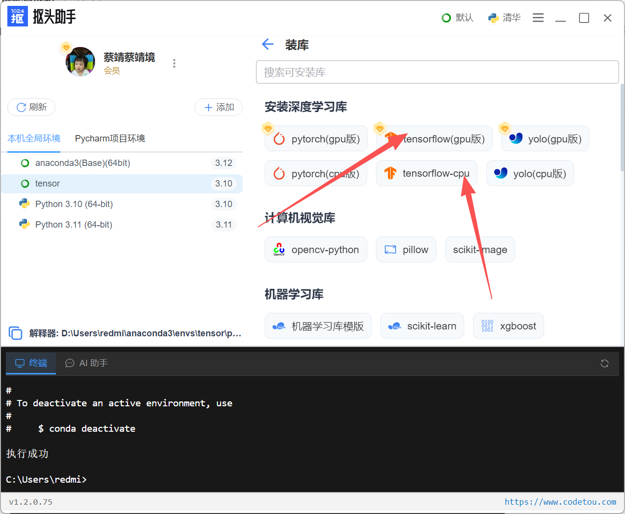 打开工具,清晰看到所有你本机的环境,选择环境后,点"装库