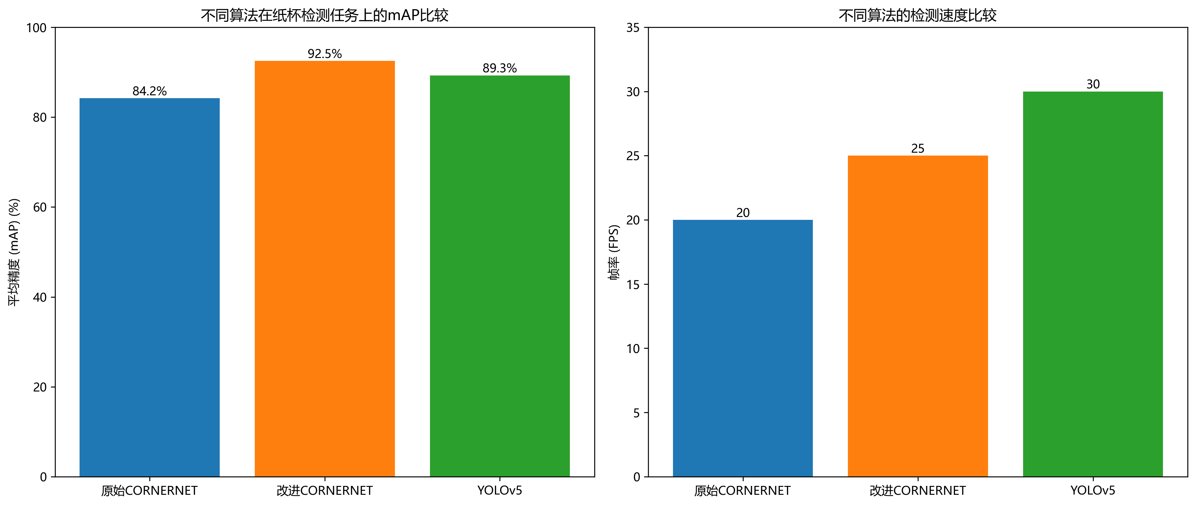 从表中可以看出,改进后的CORNERNET算法在纸杯检测任务上达到了92.5%的平均精度(mAP),比原始CORNERNET提高了8.3%,比YOLOv5提高了3.2%。虽然检测速度略低于YOLOv5,但仍然保持在25FPS,满足实时检测需求。