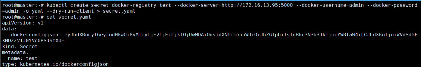 kubectl create secret docker-registry test --docker-server=http://x.x.x.x:port --docker-username=<user> --docker-password=<password> -o yaml --dry-run=client > secret.yaml