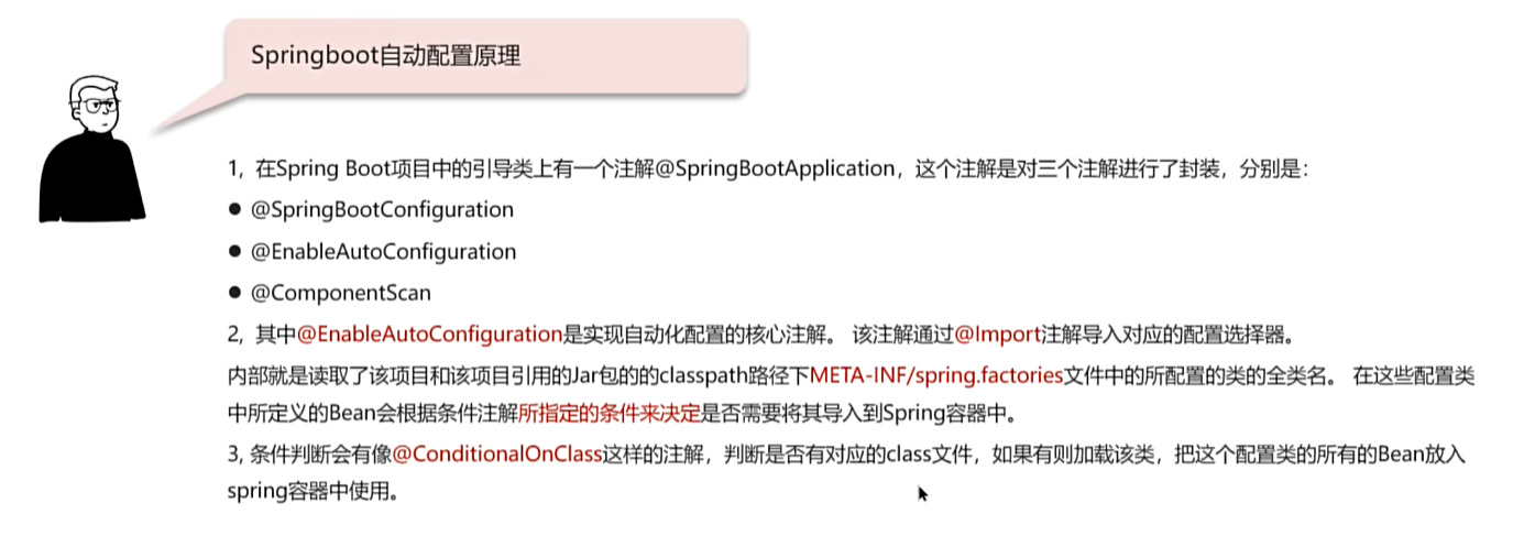 Spring Boot的自动配置原理基于@SpringBootApplication注解,它封装了@SpringBootConfiguration、@EnableAutoConfiguration和@ComponentScan。@EnableAutoConfiguration是核心,它通过@Import导入配置选择器,读取META-INF/spring.factories文件中的类名,根据条件注解决定是否将配置类中的Bean导入到Spring容器中。