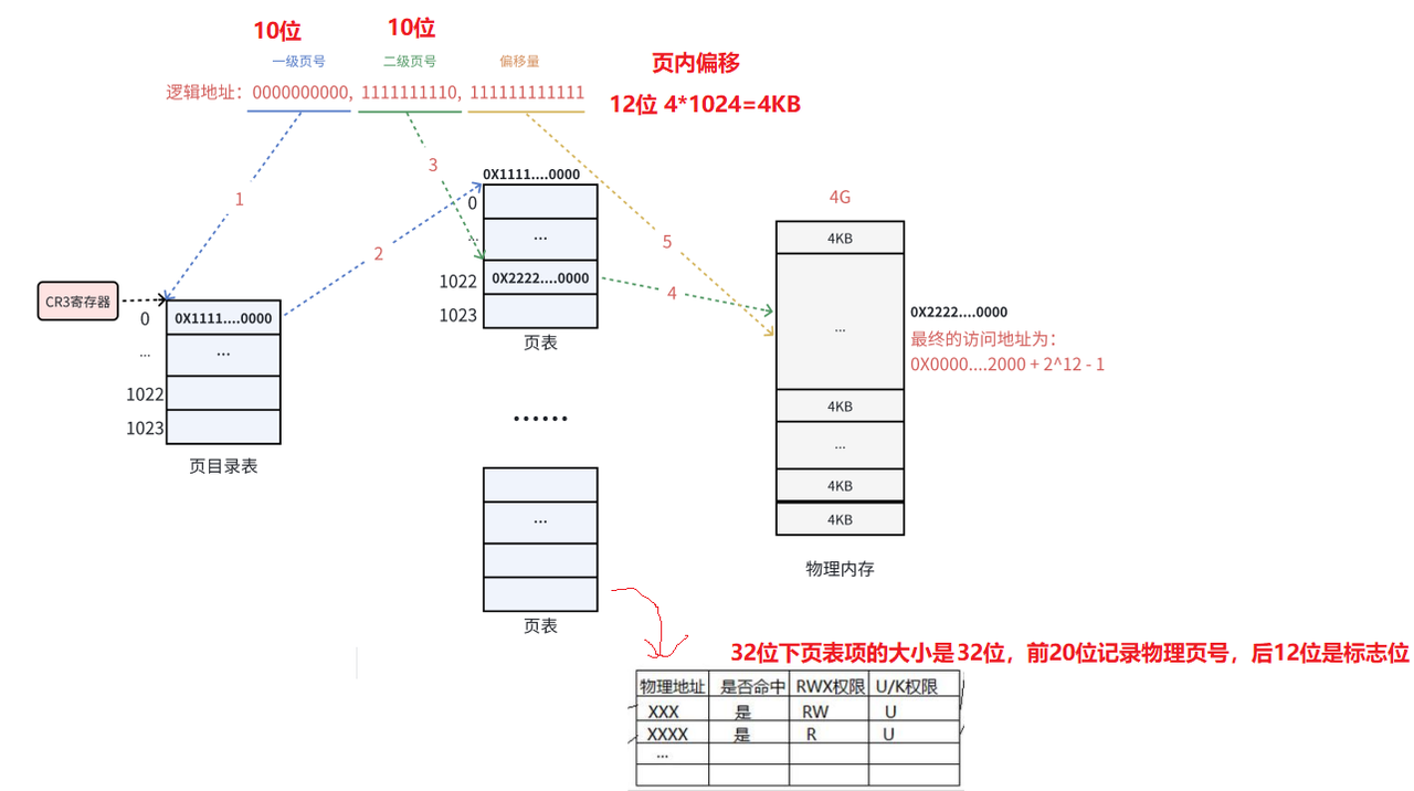 - 在32位处理器中,采⽤4KB的⻚⼤⼩,则虚拟地址中低12位为⻚偏移,剩下⾼20位给⻚表,分成 两级,每个级别占10个bit(10+10)。