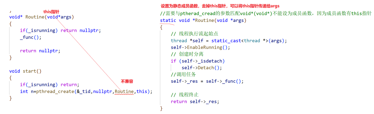 Routine函数不能设置为普通成员函数因为参数中有this指针,与pthread_create参数中的Routine函数不匹配
