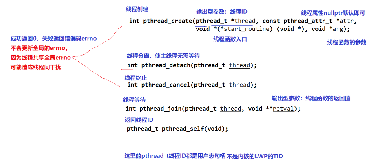 - 用户态库层:pthread 线程库封装clone()等系统调用,提供pthread_create等统一接口,屏蔽内核参数细节,确保创建的 LWP 符合线程语义。