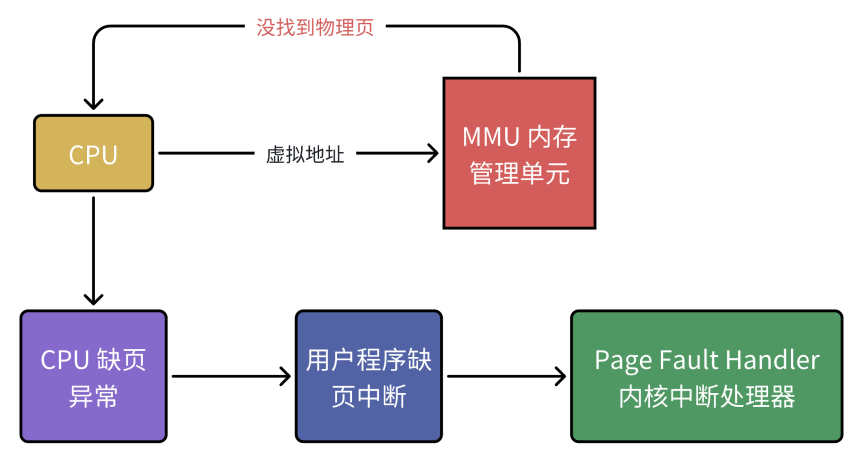当 CPU 访问某个虚拟地址时,MMU(内存管理单元)在快表和页表中都没有找到对应物理地址时,CPU会触发缺页异常(中断),此时由内核接管处理。