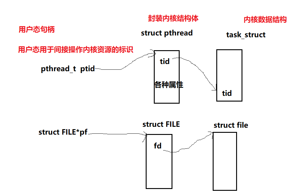 LWP在创建时通过clone()的参数设置资源共享的访问就能成为内核级线程,但这里需要让用户控制实现所以语义是不能称为线程(用户态线程)。通过pthread对系统调用进行封装就可以称为线程,这里的pthread_t就是线程句柄,可以指向struct pthread(内部包含tid),其就是对内核中轻量级进程的task_struct一层抽象,这里和c语言的struct FILE 包含fd对内核中struct file的封装类似