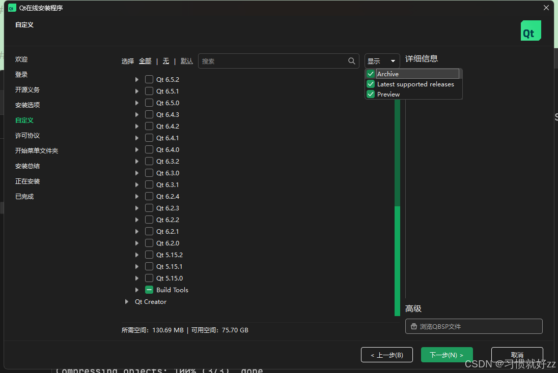 安装qt5.15.2需要选择Archive才能看到