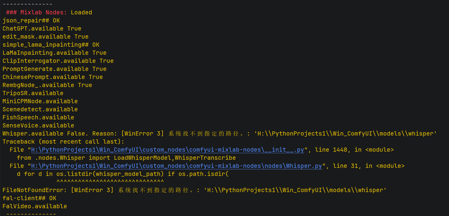 在 ComfyUI 中安装 Mixlab Nodes 插件后,控制台显示其他节点正常,便 Whisper.available False。即使环境里安装了 openai-whisper 和 faster-whisper,问题依然可能存在。