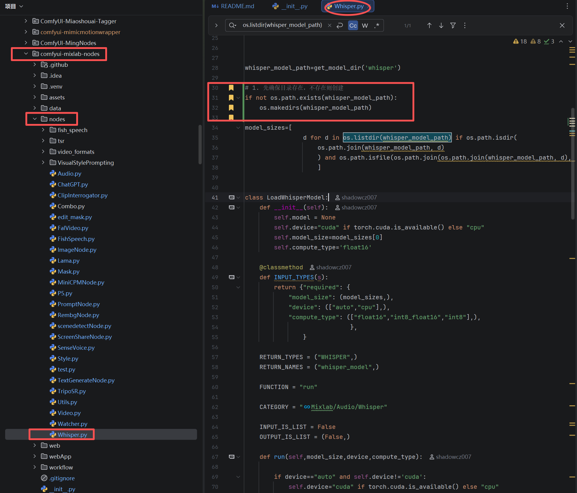 打开 custom_nodes\comfyui-mixlab-nodes\nodes\Whisper.py,在 model_sizes 扫描逻辑前加入自动创建目录的判断。