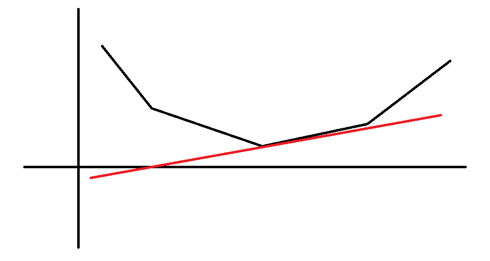 这时,这个点左边的斜率比这条直线斜率小,所以选靠右的点更好,而右边的斜率更大,所以选靠左边的点更好。也就是说:选当前这个点一定是最优的。