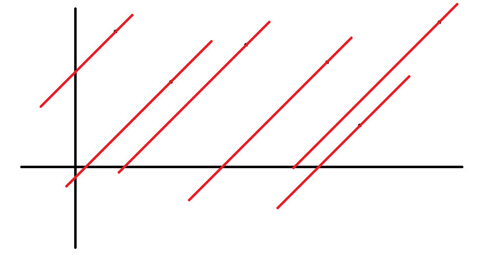 因为我们要求的是截距,也就是说:截距是不固定的。所以我们过每个点做一条直线,并且这些直线互相平行(因为斜率一定):