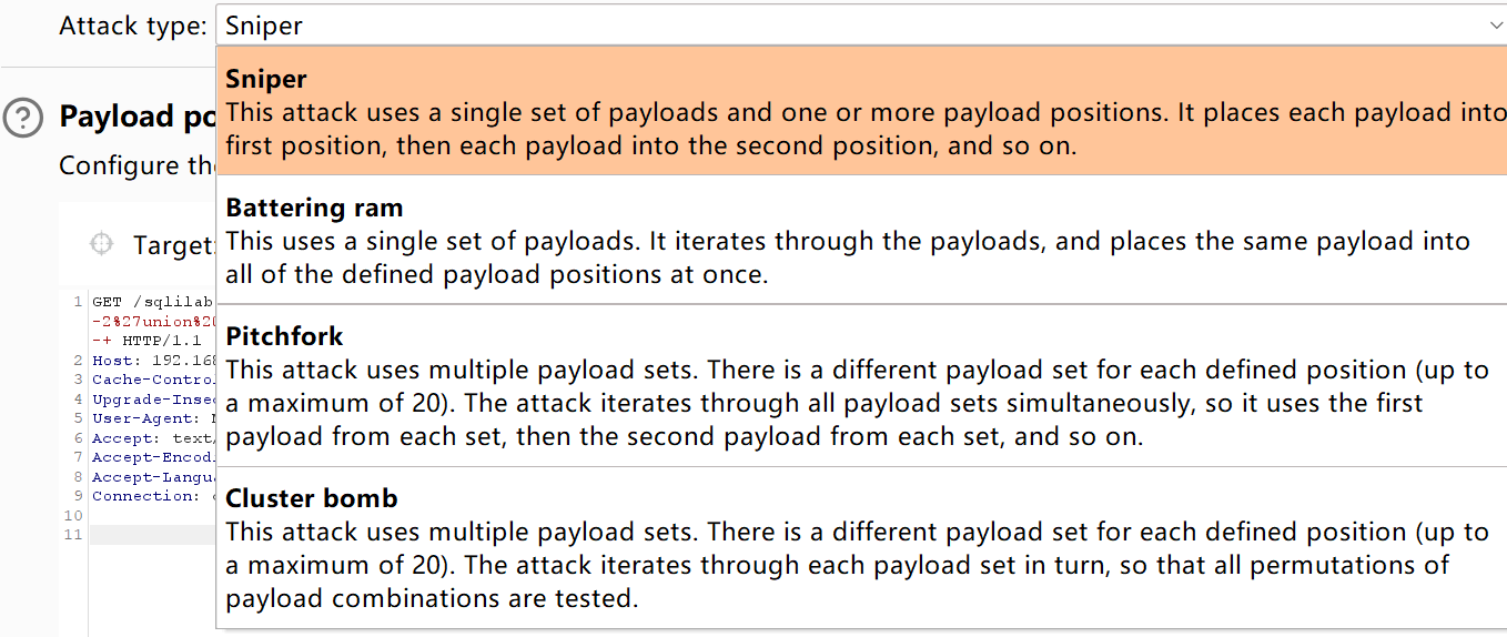 执行流程:假设位置A的Payload集是 [1, 2],位置B的Payload集是 [a, b],则顺序为:A=1 且 B=a;A=1 且 B=b;A=2 且 B=a;A=2 且 B=b。