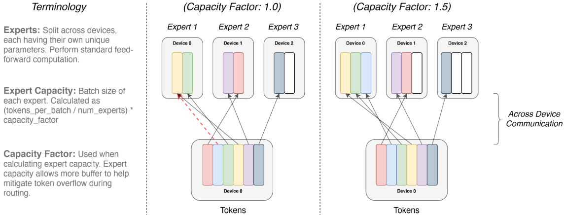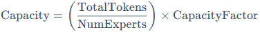 为了在硬件(如TPU)上高效运行,Switch Transformer必须解决动态路由带来的负载不均问题。由于硬件通常要求静态的Tensor形状,模型必须预设每个专家能处理的最大Token数量,即专家容量(Expert Capacity):