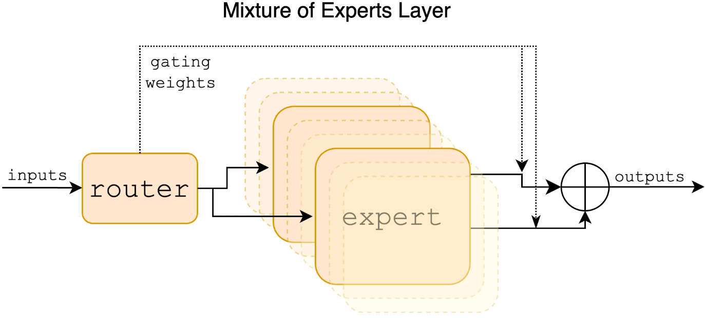 pi(x)是门控网络(Router)计算出的第i个专家的权重(通常是Softmax后的top-k概率,其余为0)。