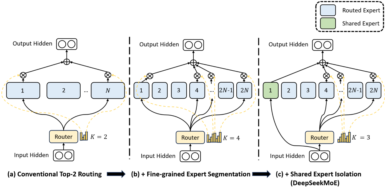 **细粒度专家分割(Fine-Grained Expert Segmentation):**DeepSeek将一个标准的大专家拆分为多个更小的专家。对比(a)和(b)可以看到,原本的专家1被进一步拆分为更小的专家1和2。为了保持总计算量不变,激活的专家数量K也相应倍增(从K=2变为K=4)。这种变化使组合的可能性呈指数级增加,让模型能更灵活地组合不同的"知识碎片"来应对复杂输入,从而实现了更高的专家专业化。
