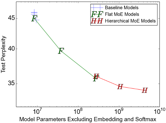 **引入噪声的稀疏门控:**传统的Softmax门控通常会给所有专家分配非零的权重,意味着所有专家都要参与计算,无法节省算力。为此,论文引入了一种带噪声的门控机制:在门控输入中加入可训练的高斯噪声,计算后仅保留权重最大的k个专家(例如k=4),将其余所有专家的权重强制置为负无穷(即概率为0)。如下图所示,这种稀疏性带来了巨大的收益。在保持计算预算(每步约800万次运算)基本不变的情况下,随着专家数量从4个增加到4096个(横轴),模型参数量剧增,但测试集困惑度(纵轴)明显下降。说明条件计算可以在不增加推理成本的前提下,利用海量参数大幅提升性能。