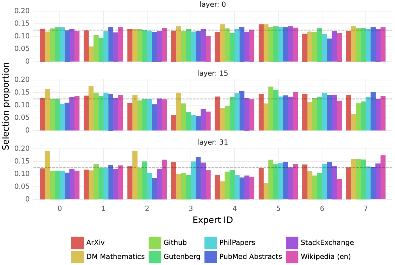 他们统计了不同领域数据(如arXiv,PubMed,Wikipedia等)在不同层(Layer0,15,31)的专家比例分配。如下图所示,同一行(即同一个专家)在不同列(不同数据集)上的颜色深浅非常接近。这说明,无论输入文本属于哪个领域,Router选择各专家的概率分布几乎是一样的。专家似乎更多地是根据语法和Token结构来分工,而非人类定义的知识领域。