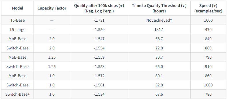 虽然GShard验证了规模化路径,但大规模MoE的训练仍面临复杂性高、通信成本大和训练不稳定等挑战。2021年Google推出的Switch Transformer通过简化路由算法和改进训练技术,成功将参数量推向了1.6万亿级别,同时实现了4倍于T5-XXL的训练速度提升。通过下表可以看出,在相同的算力预算下,Switch Transformer无论是在质量(负对数困惑度)还是在速度上,都全面超越了传统的T5模型以及早期的MoE模型。