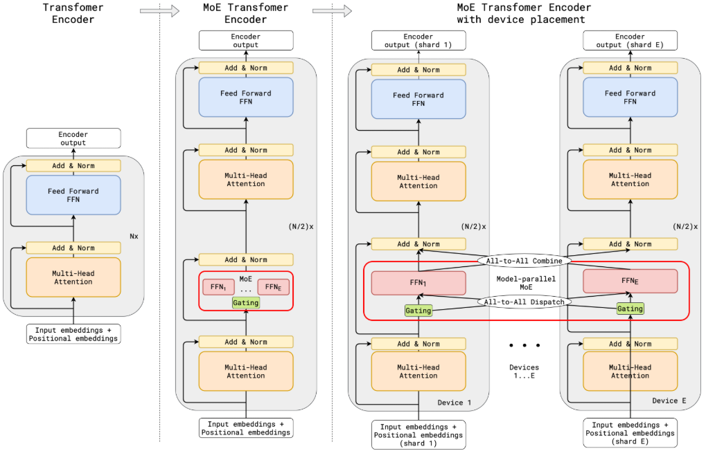 下图展示了从标准Transformer到分布式MoE的演进。(a)标准Transformer编码器堆叠了Self-Attention和FFN层;(b)MoE Transformer将每隔一个FFN层替换为MoE层;(c)在跨设备扩展时,Attention层(黄色)在所有设备间复制,而MoE层(红色)则被分片存储。这种"复制与分片"结合的策略,既保证了非MoE层的高效计算,又通过分片突破了单设备的显存限制。