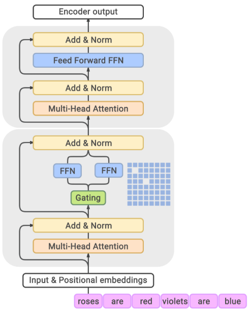 GLaM展示了如何将MoE层有效地应用于Decoder-only的语言模型。如下图所示,它采用了隔层替换策略,即在标准的Transformer堆叠中,每隔一个层(upper block)将其中的FFN替换为MoE层(bottom block)。