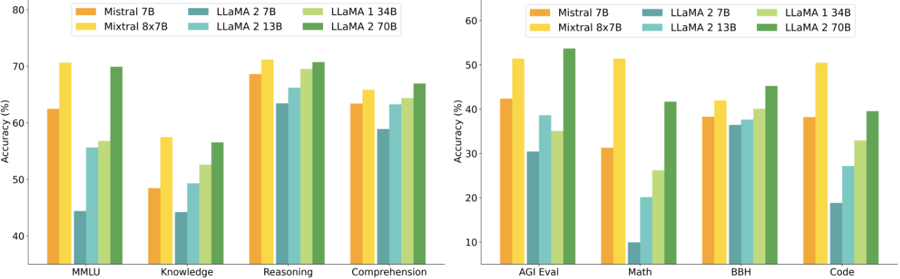 **性能表现:**在GSM8K(数学)、MMLU(综合知识)、HumanEval(代码)等基准测试上,Mistral 8x7B以13B的活跃参数量超越了稠密的Llama2 70B(绿色柱状图),特别是在数学和代码生成任务上,其优势尤为显著。