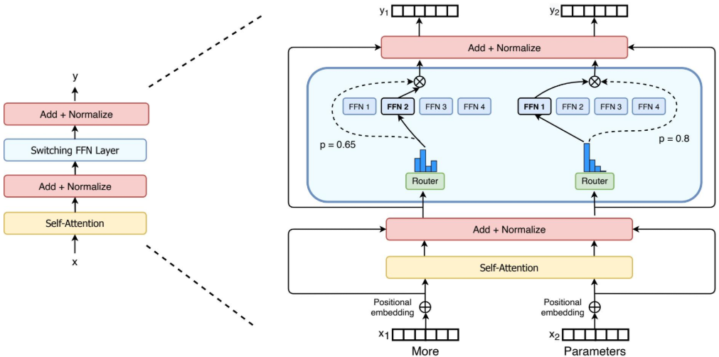 Switch Transformer的主要创新在于提出了Switch Layer。如下图所示,它用稀疏的Switch FFN层(浅蓝色区域)替换了标准Transformer中的稠密FFN层。在该层中,对于输入序列的每个Token,路由器(Router)会计算路由概率,并将其分发给唯一的一个专家(实线箭头)进行处理。