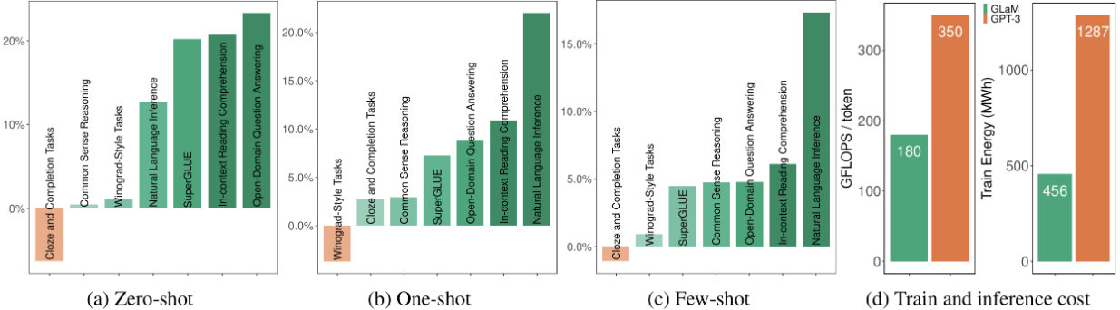 如下图所示,GLaM(绿色)在Zero-shot(a)、One-shot(b)和Few-shot(c)设置下,绝大多数任务上都全面优于GPT-3(橙色)。特别是在图(d)的成本对比中,GLaM的推理计算量仅为GPT-3的一半,训练总能耗更是大幅下降至1/3。