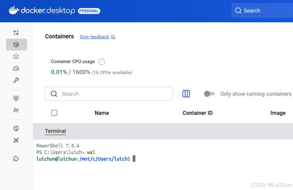 Windows Docker Desktop 基于 WSL2,用户可在同一个终端窗口内自由切换 Windows 和 Linux 环境,无需额外打开 Linux 终端或虚拟机界面。