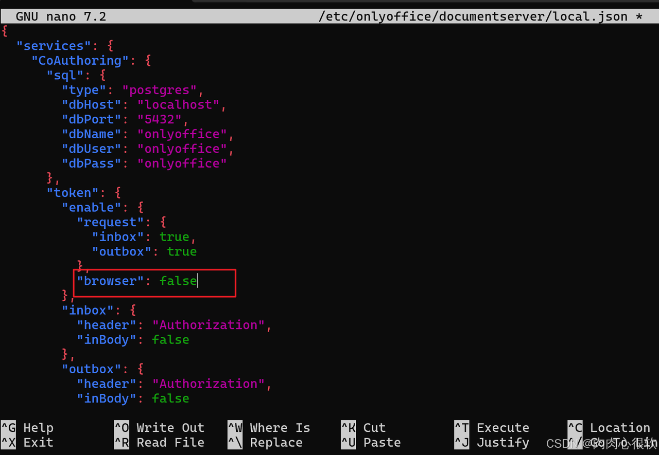 - 此时会在底部提示 "File Name to Write: /etc/onlyoffice/documentserver/local.json",直接按Enter键确认保存路径;